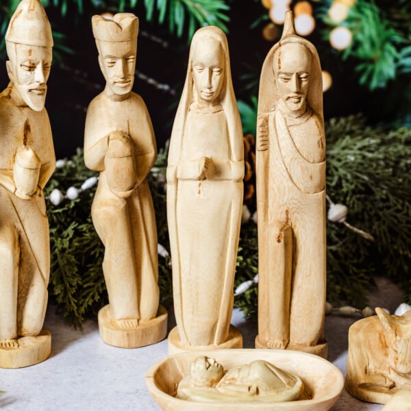 Celebrate the story of Christmas with our Hand-Carved Musave Wood Nativity Set. beautifully crafted in Rwanda from the native Musave and Jacaranda trees. Each nine-piece set includes Jesus in a manger. Mary. Joseph carrying his travel staff. a shepherd in traditional Rwandan garb. three kings presenting treasures in woven baskets. and two animals. The figures. averaging 8.5″ tall. are finished in natural beeswax to showcase the warmth and beauty of the wood. Ethically made and fair trade certified. this nativity set is more than a decoration??it’s a meaningful heirloom that supports artisans and their communities.