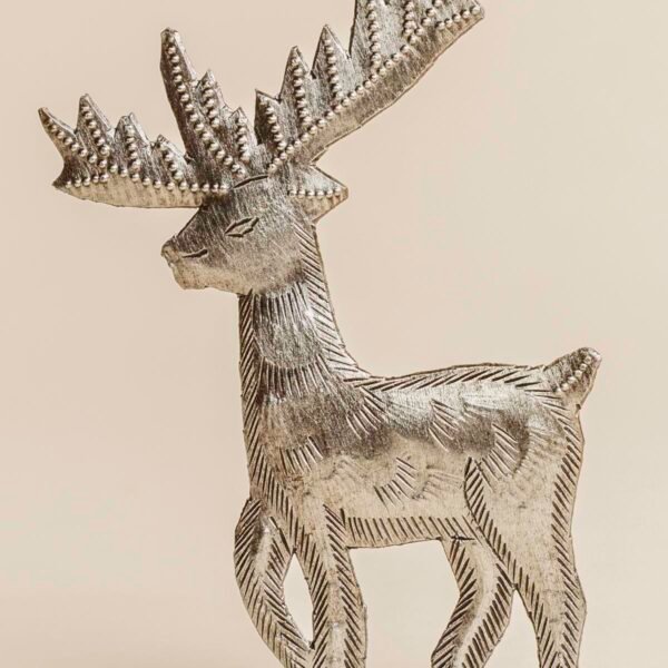 Display this sweet pair of silver reindeer on the mantelpiece or as an elegant centerpiece during holiday meals. Hand-hammered and hand-chiseled detailing gives each reindeer a unique personality and a pose all their own!