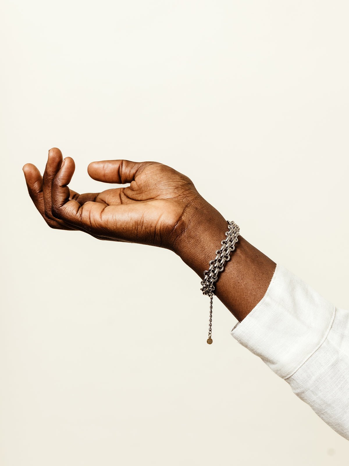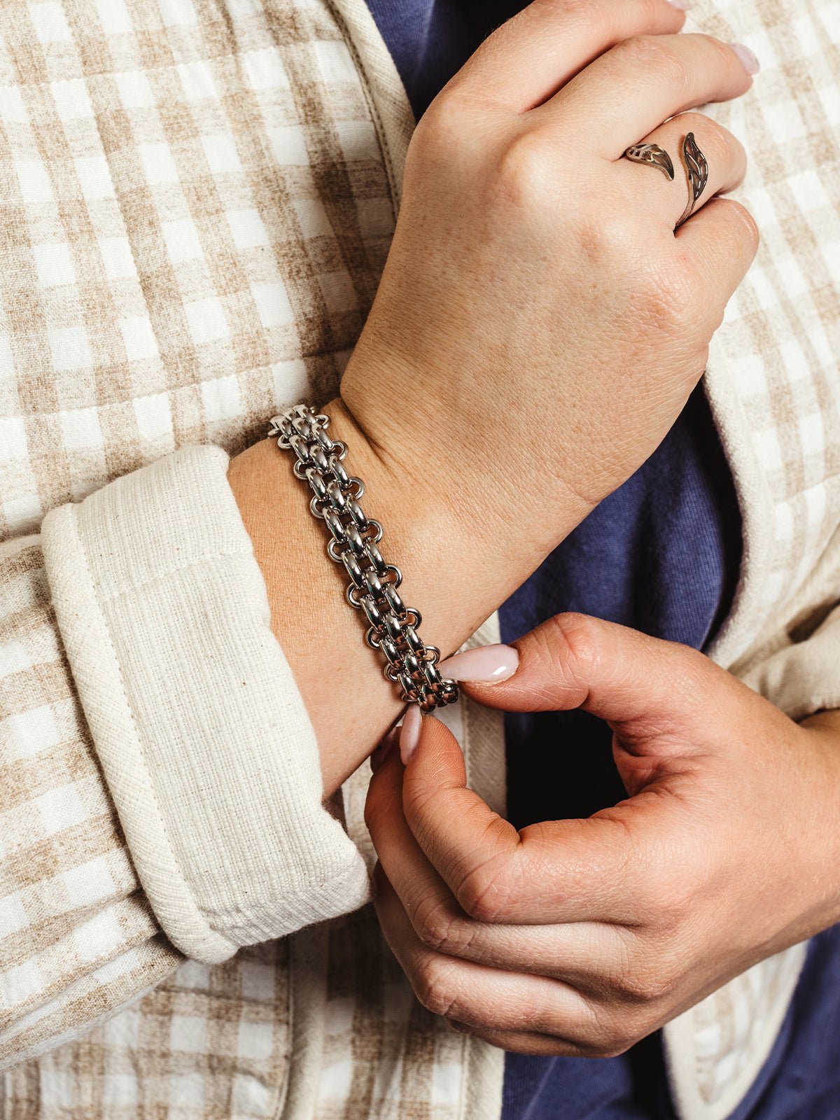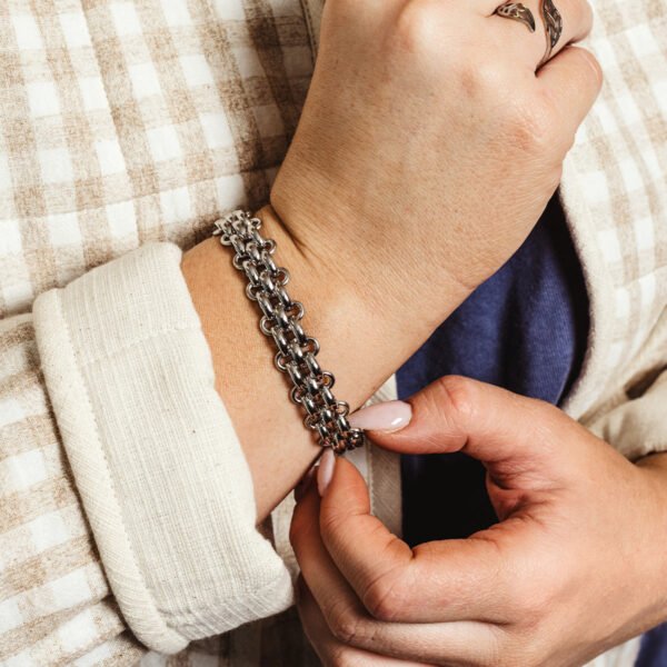 Bold meets refined in the Magen Chunky Silver Chain Bracelet. Ethically handcrafted in Asia. this stainless steel bracelet is .5″ wide and designed to make an impact. With a 7.5″ length plus a 2″ extender. lobster clasp closure. and a hypoallergenic finish. it’s the perfect balance of strength and style.